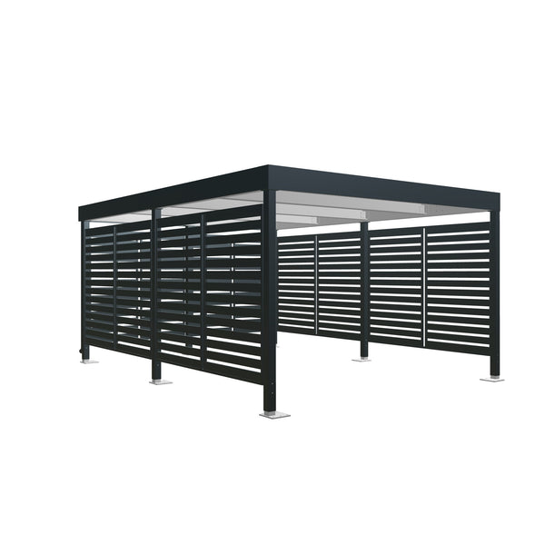 Prístrešok je možné osadiť bočnými stenami s lamelami z hliníku, dreva alebo WPC.