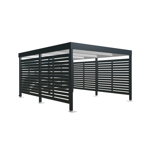 Prístrešok je možné osadiť bočnými stenami s lamelami z hliníku, dreva alebo WPC.