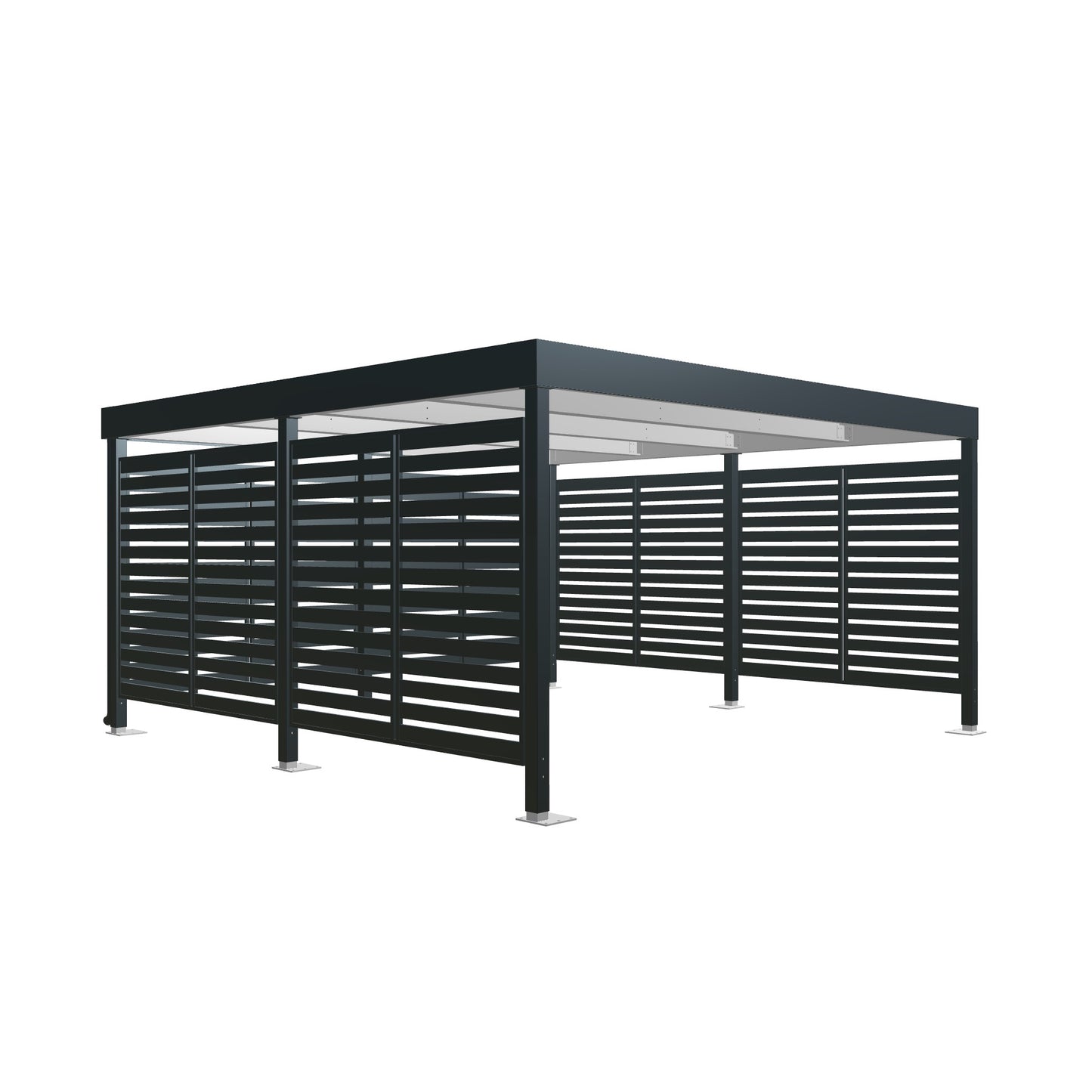 Prístrešok je možné osadiť bočnými stenami s lamelami z hliníku, dreva alebo WPC.