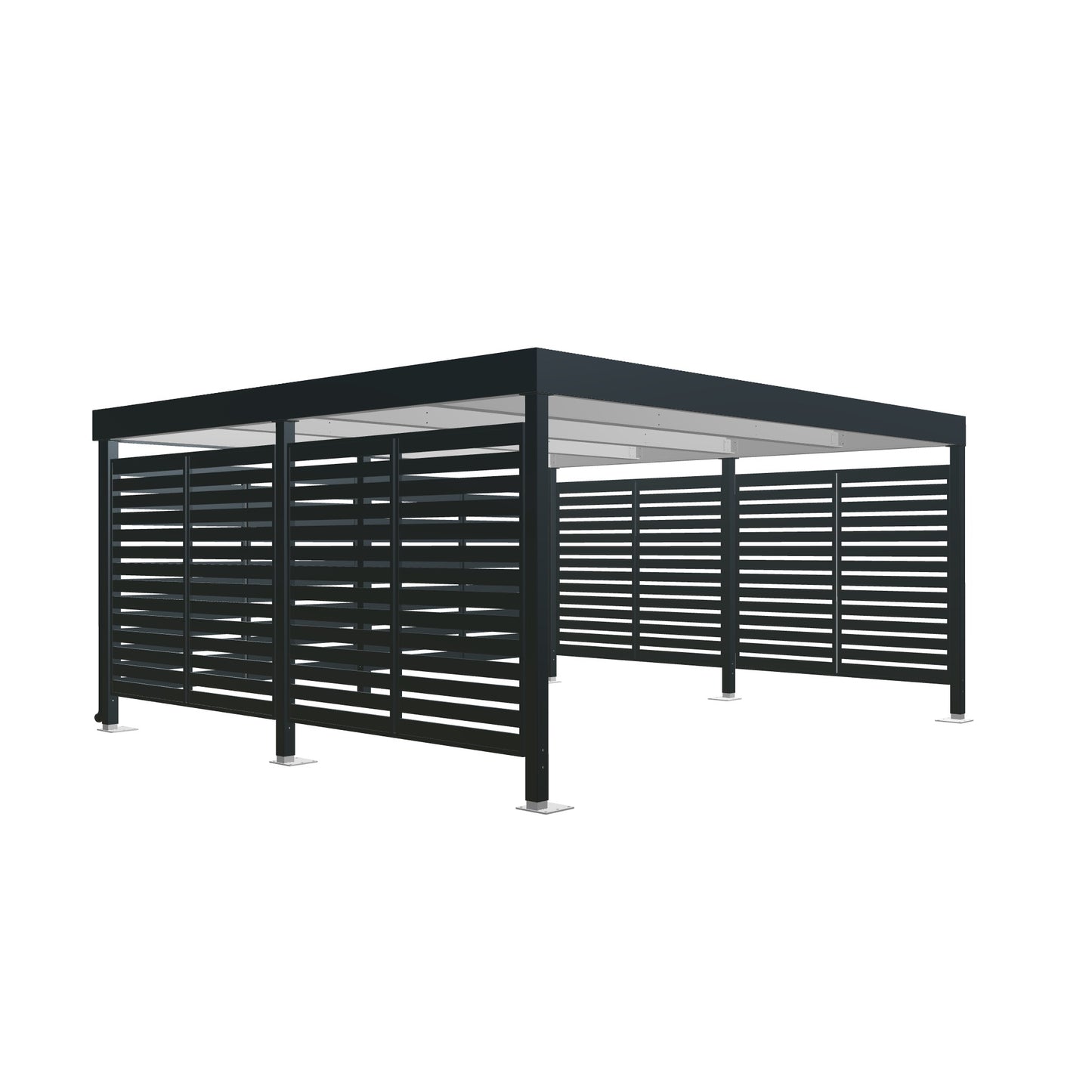 Prístrešok je možné osadiť bočnými stenami s lamelami z hliníku, dreva alebo WPC.