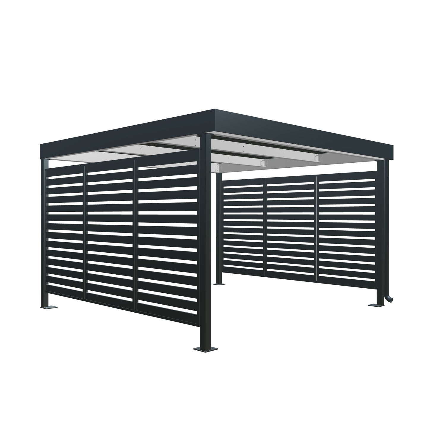 Prístrešok je možné osadiť bočnými stenami s výplňami z dreva, WPC, hliníka alebo iných materiálov.