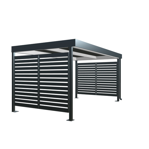 Prístrešok je možné osadiť bočnými stenami s výplňami z dreva, WPC, hliníka alebo iných materiálov.