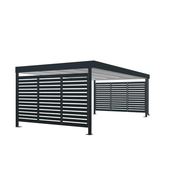 Prístrešok je možné osadiť bočnými stenami s výplňami z dreva, WPC, hliníka alebo iných materiálov.